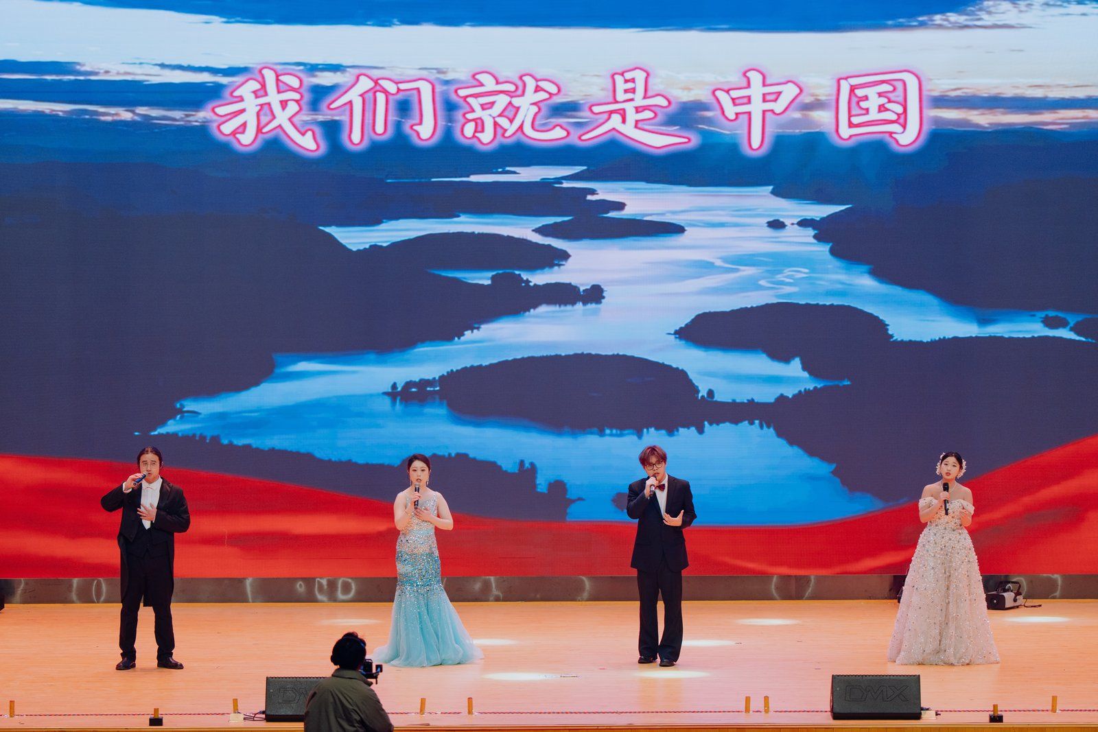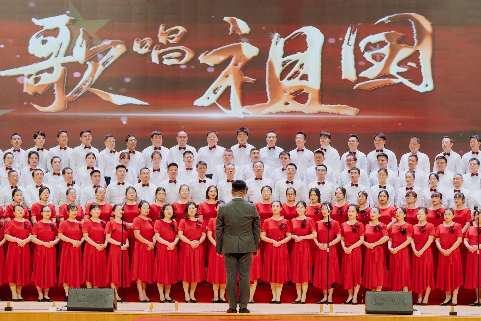 陕服教师合唱团合唱《歌唱祖国》《没有共产党就没有新中国》在深情旋律中拉开晚会序幕。老师们精神饱满、歌声嘹亮,用真挚的情感致敬祖国、致敬时代,彰显家国情怀与责任担当。