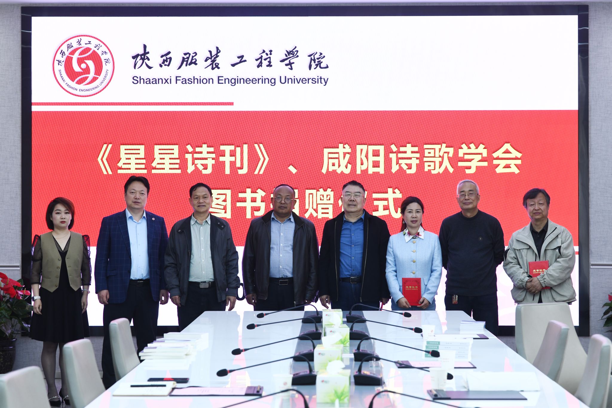 陕服新闻网讯(习如雪)4月10日上午,《星星诗刊》副主编李自国、咸阳诗歌学会会长凌晓晨等一行6人来我校参观交流,并为我校捐赠了图书。捐赠仪式在季羡林国学院一楼会议室举行。