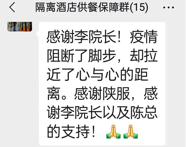 “感谢李院长!疫情阻断了脚步,却拉近了心与心的距离。感谢陕服,感谢陕服的领导以及陈总的支持!”这是沣西新城组织部一位领导在隔离酒店群发来点赞陕服的话语。