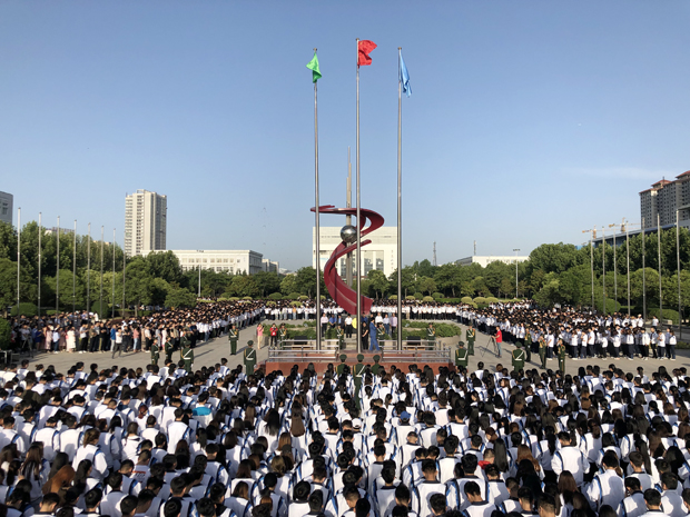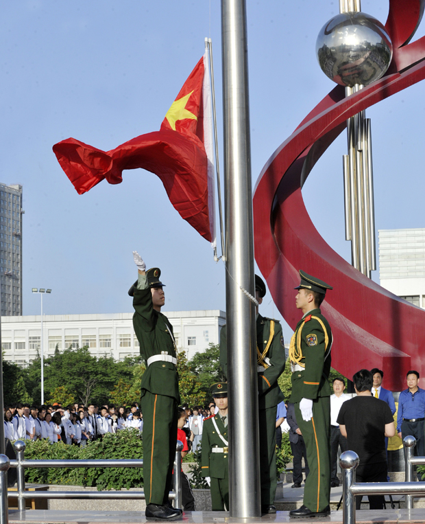 胡鸿晓主持。一声令下,英姿飒爽的国旗护卫队员护送鲜艳的五星红旗进场。在庄严的《国歌》声中,五星红旗冉冉升起,迎风飘扬。现场的每一个人向国旗行注目礼,表达对祖国无限的热爱和崇高的敬意。