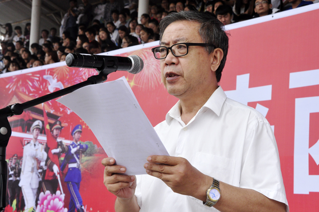 雨后的田径场绿草如茵,彩旗飘扬,几十盆鲜花鲜艳夺目,10个鲜艳的气球载着标语腾空而起。经历了十多天军训的2014级新生排列成30个方队,队列整齐,歌声嘹亮,展示了他们青春的活力和勃勃英姿。近6000名往届学生坐满了看台,共迎新的学年。